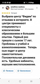 Выбрала центр "Фидем" по отзывам в интернете. В центре принимают специалисты с классическим образованием и большим опытом. Первый раз пришли с сыном 17 лет. Проблемы с учебой и взаимопониманием. Теперь сын ездит в центр самостоятельно. Положительная динамика есть. Удобные кабинеты, хорошее местоположение. 12.03.22
