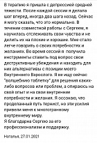 В терапию я пришла с депрессией средней тяжести. После каждой сессии я делала шаг вперед, иногда два шага назад. Сейчас я могу сказать, что это нормально. В течении совместной работы с Сергеем, я научилась отслеживать свои чувства и не делить их на плохие и хорошие. Мне стало легче говорить о своих потребностях и желаниях. Во время сессий я получила инструменты ставить под вопрос свои деструктивные убеждения и находить для них альтернативы с позиции моего Внутреннего Взрослого. Я не ищу сейчас “волшебную таблетку” для решения каких-либо вопросов или проблем, а опираюсь на свой опыт и на свои внутренние потребности и желания. Я осознаю, что проделанный путь тернист, но эти усилия привели меня к многогранному внутреннему миру. Я благодарна Сергею за его профессионализм и поддержку. Наталья, 27.01.2021