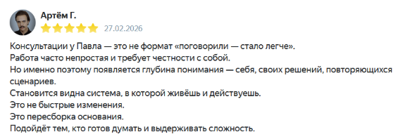 Я была на коучинге у Павла. В тот период моей жизни у меня было ощущение, что всё идёт не так. Как будто я проживаю не свою жизнь. Это чувство не давало мне покоя. Я решила, что мне нужна помощь квалифицированного специалиста и обратилась в Фидем к Павлу. С первых же минут я ощущала комфорт в общении и могла доверительно рассказать обо всем, что меня беспокоит. Павел использовал различные техники, чтобы я смогла наконец осознать, кто я, кем хочу быть и какой хочу создавать свою жизнь. Каждая сессия приближала меня к этому и я становилась всё более уверенной в своих силах. Павел оказал мне ту помощь, в которой я нуждалась. Я выражаю огромную благодарность Павлу и Фидем за проделанную работу! 14.07.20 Ольга